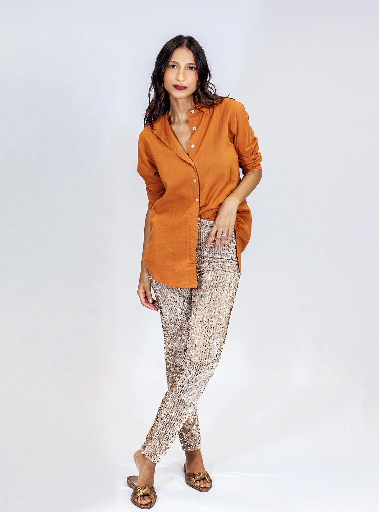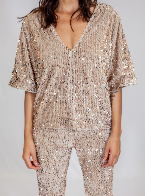 Cintura alta em veludo com aplicação de paetês e forro de Poliamida.