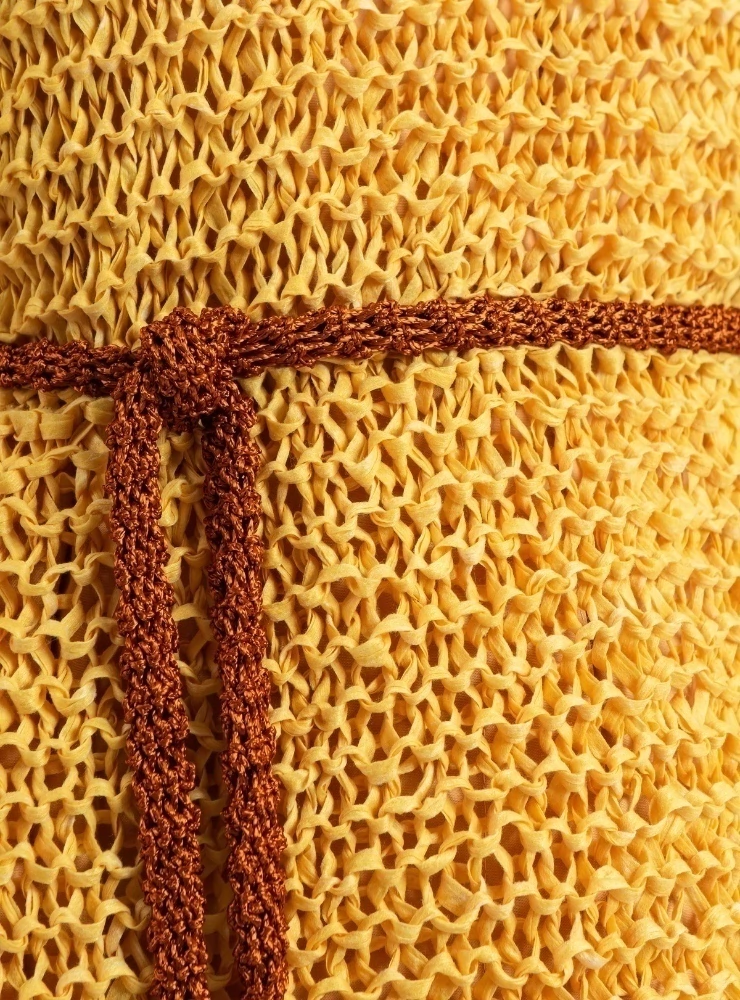 A peça em trançada em fitas de algodão que se expandem conforme o corpo. Ela acompanha dois pares de alfinetes para que você explore todas as fotos de uso.